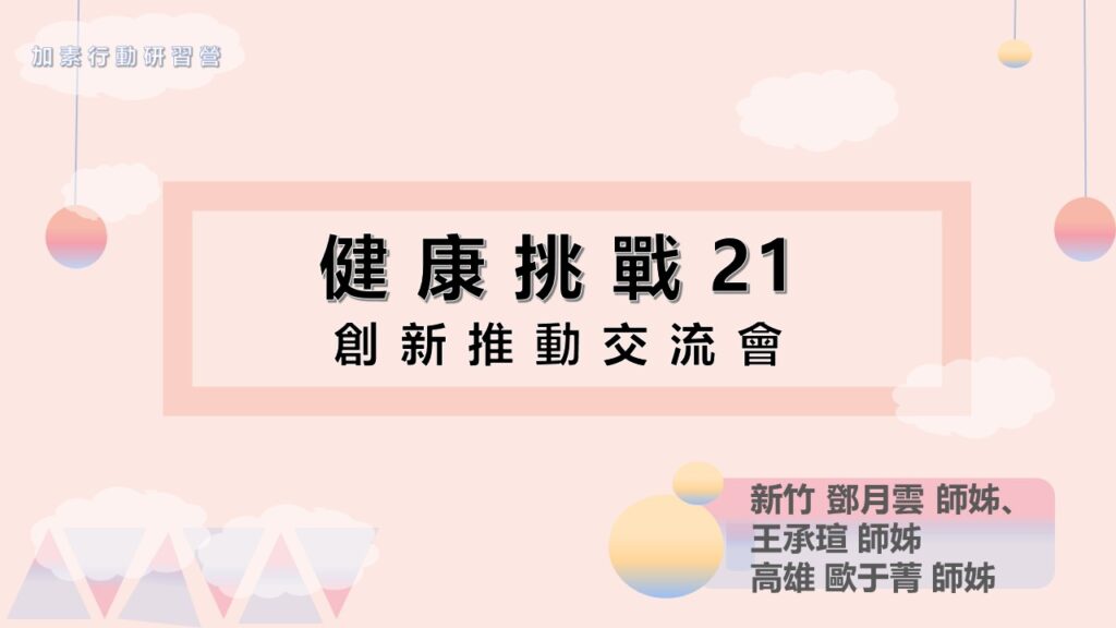 營隊課程_健康挑戰21 創新推動交流會 瀏覽人數: 271 Kindly go to setting page and check the option "Place them manually" 內容簡介: 課程主題:營隊課程_健康挑戰21 創新推動交流會 課程講師:新竹 鄧月雲師姊、王承瑄師姊及高雄 歐于菁師姊 課程長度:1小時 課程簡介: 健康挑戰21自2020年底從馬來西亞開始推動,並持續推廣至台灣、新加坡、美國等國家地區。 此交流會,特別邀請新竹團隊分享,如何從一和氣推動到八和氣的願行及開放多元訂餐後吸引更多人報名參加健康挑戰21的妙法;也邀請高雄團隊分享為醫師舉辦14天體驗活動的迴響及溫馨故事,短短一小時有許多撇步及經驗等你來了解。 關鍵字 #健康挑戰21、健康挑戰、新竹、高雄 相關連結 No items found 相關下載 No items found 詳細資料 分類:加素行動研習, 推素好課程, 環保教育, 開放資源, 非素不可 版本說明:2022年07月加素行動研習營 資料日期:2022-07-02 作者:新竹 鄧月雲師姊、王承瑄師姊及高雄 歐于菁師姊 開放對象:培訓委員, 培訓慈誠, 委員, 常住師父, 慈誠, 榮董, 社區志工, 職工, 見習委員 資料來源:慈善基金會執行長辦公室推素團隊