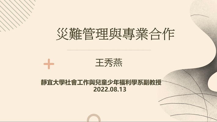 關懷士培訓_災難管理與專業合作 瀏覽人數: 36 Kindly go to setting page and check the option "Place them manually" 內容簡介: 課程主題:關懷士培訓_災難管理與專業合作 課程講師:王秀燕 老師 課程長度:71分鐘 相關連結 No items found 相關下載 No items found 詳細資料 分類:深耕慈善, 災害救助與管理, 關懷士培訓課 版本說明:佛教慈濟慈善事業基金會關懷士培訓課程第一期 資料日期:2022-08-13 作者:王秀燕 老師 開放對象:委員, 常住師父, 慈誠, 職工 資料來源:中區關懷士培訓