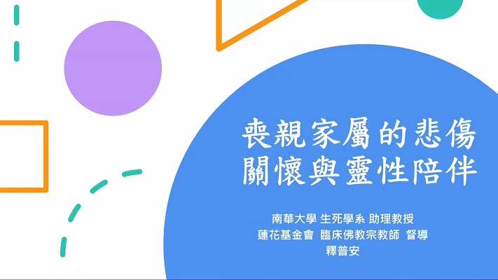 關懷士培訓_喪親家屬的悲傷關懷與靈性陪伴 瀏覽人數: 72 Kindly go to setting page and check the option "Place them manually" 內容簡介: 課程主題:關懷士培訓_喪親家屬的悲傷關懷與靈性陪伴 課程講師:普安法師 課程長度:68分鐘 相關連結 No items found 相關下載 No items found 詳細資料 分類:案家陪伴與關懷, 深耕慈善 版本說明:佛教慈濟慈善事業基金會關懷士培訓課程第一期 資料日期:2022-08-28 作者:普安法師 開放對象:委員, 常住師父, 慈誠, 職工 資料來源:北區關懷士培訓