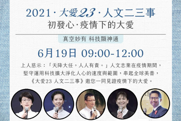 2021大愛23_人文二三事 瀏覽人數: 199 Kindly go to setting page and check the option "Place them manually" 內容簡介: 【天地示警 大哉教育】 上人慈示:「天降大任,人人有責。」人文志業在疫情期間,堅守運用科技擴大淨化人心的速度與範圍,串起全球美善,[大愛23 人文二三事]邀您一同見證疫情下的大愛。 2021年6月19日星期六 【人文精進課程/線上共修】 透過人文志業講師如是我聞、如是我做,帶您見證【疫情無常,大愛如常】 2021【大愛23 人文二三事】 初發心-疫情下的大愛 主持人: 黃添明 09:00-09:45 報真導正 安定人心/講師: 葉樹姍 09:45-10:30 這疫刻.安心/講師: 陳竹琪 10:30-11:00 法音宣流 聞法 說法 傳法/講師: 張勝全 11:00-11:30 疫情下 精進如常/講師: 杜玉萍 11:30-12:00 阿明來報喜/講師: 黃添明 歡迎廣邀家人一同見證 【慈濟大愛 一直都在】 課程首播網址連結 https://reurl.cc/j8ljDZ 相關連結 No items found 相關下載 No items found 詳細資料 分類:社區愛灑, 開放資源 版本說明:慈濟精進資源網 資料日期:2021-06-17 作者:大愛電視 開放對象:培訓委員, 培訓慈誠, 委員, 常住師父, 慈誠, 榮董, 社區志工, 職工, 見習委員 資料來源:大愛電視