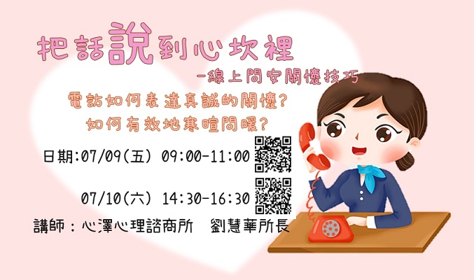 線上問安關懷技巧 瀏覽人數: 350 Kindly go to setting page and check the option "Place them manually" 內容簡介: ♥️回顧精彩課程~【線上問安關懷技巧】把話說到心坎裡: 2021年7月9日 課程影片:https://youtu.be/Ikun3s9u8Bc 2021年7月10日課程影片:https://youtu.be/R8saY28mXDI *講師講義:下載請點此 *講師:心澤心理諮商所 劉慧華所長 *課程目標:掌握電訪關懷的關鍵、提升問安技巧、傳遞溫暖與關懷! 可應用於各面向的電訪關懷–慈善訪視、組隊法親關懷祝福、會所諮詢值班接聽電話… 相關連結 No items found 相關下載 No items found 詳細資料 分類:傳承與陪伴, 社區愛灑, 開放資源 版本說明:慈濟精進資源網 資料日期:2021-07-09 作者:心澤心理諮商所 劉慧華所長 開放對象:培訓委員, 培訓慈誠, 委員, 常住師父, 慈誠, 榮董, 社區志工, 職工, 見習委員 資料來源:慈濟基金會宗教處
