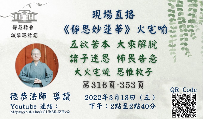 請大家告訴大家,2022年03月18日(星期五),午間祈禱後,二點至二點四十分,我們一起來聞法精進,由靜思精舍德恭法師為大家直播導讀。