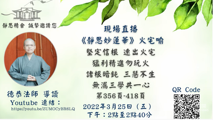 《靜思法髓妙蓮華》火宅喻 第356-418頁 瀏覽人數: 129 Kindly go to setting page and check the option "Place them manually" 內容簡介: 導讀人:德恭法師 日 期:2022年03月25日(星期五) 時 間:下午 2:00-下午2:20(台灣時間) 連 結:https://www.youtube.com/watch?v=ZUMOCyBR6LQ 敬愛的全球慈濟法親們,大家平安吉祥! 法華會上,您我同行菩薩道。 【進入法華七喻的火宅喻】 《妙法蓮華經》旨在教菩薩法,乃開權顯實之諸佛本懷,是事理圓融之中道,是真空妙有之圓教,為諸經之王,一乘實相,成佛唯一之教。 《靜思法髓妙蓮華》,是 證嚴上人融會經文妙義與講法手札,相連貫、互呼應,宛轉委曲、微妙細膩,顯示真實甚深法藏之奧祕境界。 在此誠摯邀請全球慈濟人,線上複習《靜思法髓妙蓮華》-七譬喻之火宅喻。 請大家告訴大家,2022年03月25日(星期五),午間祈禱後,二點至二點四十分,我們一起來聞法精進,由靜思精舍德恭法師為大家直播導讀。 相關連結 No items found 相關下載 No items found 詳細資料 分類:法脈宗門, 開放資源, 靜思妙蓮華品書會 版本說明:慈濟精進資源網 資料日期:2022-03-25 作者:德恭法師 開放對象:培訓委員, 培訓慈誠, 委員, 常住師父, 慈誠, 榮董, 社區志工, 職工, 見習委員 資料來源:TCnews慈善新聞網