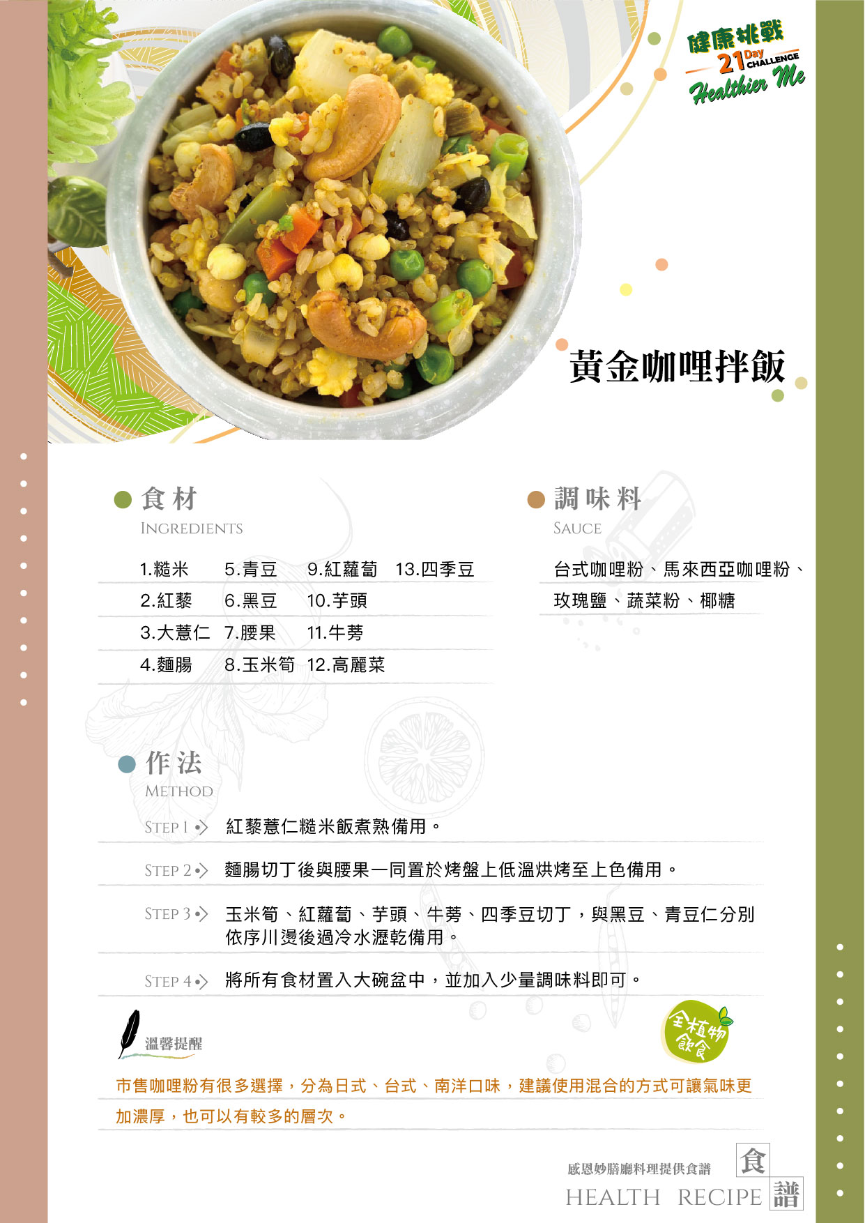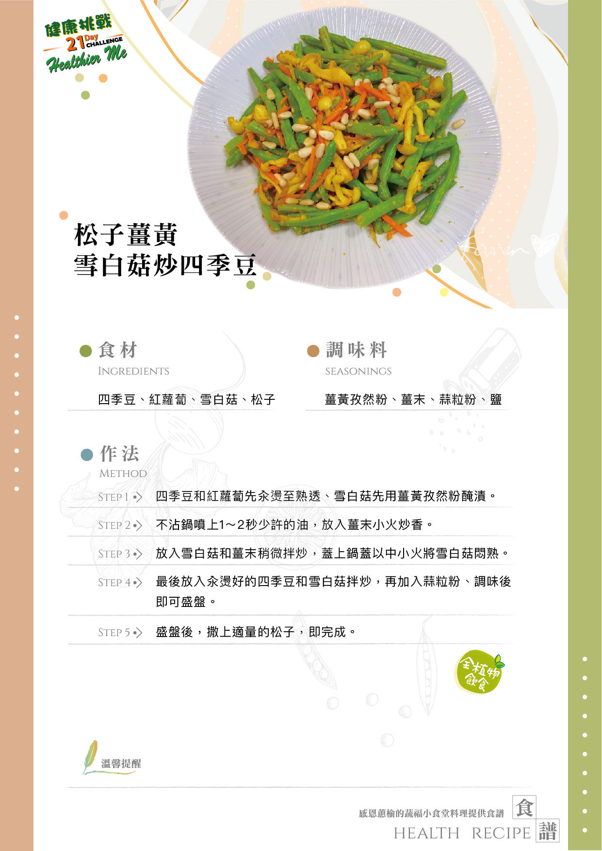 南瓜糙米飯 亞洲蘿勒豆腐+有機生菜包黃豆芽 五穀堅果烤飯 薑黃壽司 蔥香杏鮑菇番茄 蒜香孢子甘藍 無油蒸唐辛子金針菇佐黑芝麻 無油無糖滷味 松子薑黃雪白菇炒四季豆 蔥香豆包番茄 黃金咖哩拌飯 藥膳養生鍋 頁面1 頁面2 頁面3 頁面4 頁面5